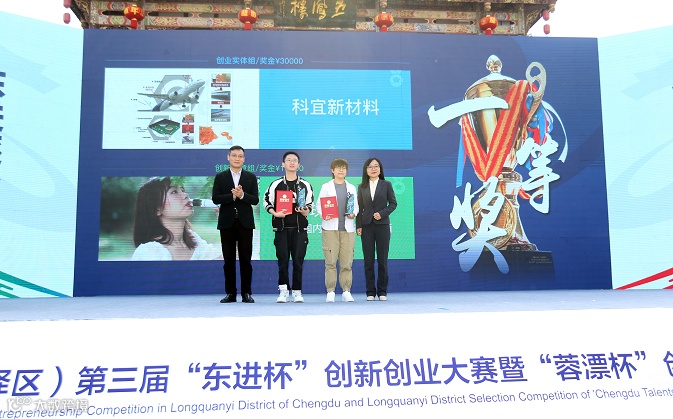 “东进杯”创新创业大赛是培养创新人才、树立创业典型的重要平台,以“东进逐梦·创驿未来”为主题的第三届“东进杯”创新创业大赛暨“蓉漂杯”创业主题赛事2020年10月28日正式启动,主要面向龙泉驿区青年创业者、驻区高校在校大学生,分创新实体项目和创新创意项目两个板块。科宜新材料、玫语甜言两个项目历经海选、初赛、决赛等环节,一路过关斩将、拔得头筹,分别斩获创业实体组和创新创意组一等奖。
