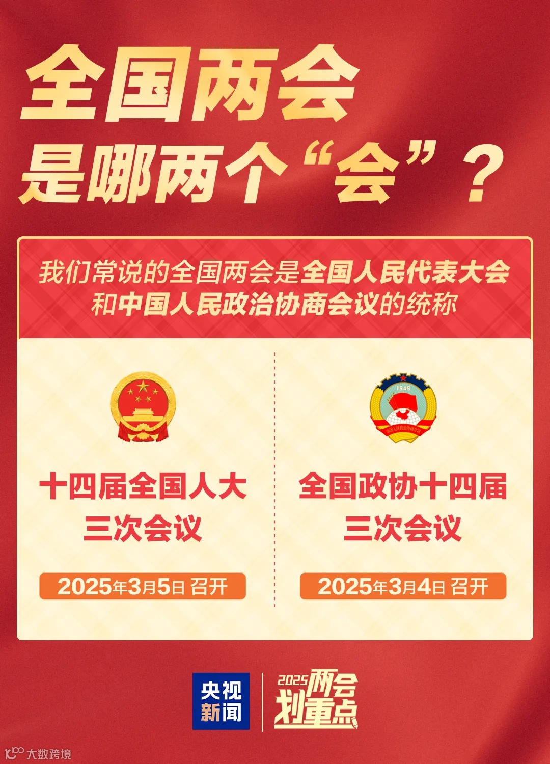 全国两会召开在即!关于全国两会,你知道多少?全国两会指的是哪两个“会”?今年的两会有哪些议程?一组图,带你快速了解↓↓↓
