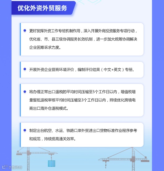 (四)优化外资外贸服务。更好发挥外资工作专班机制作用,深入开展外商投资服务专项行动,优化省、市、县三级协调服务长效机制,进一步加大统筹协调解决企业困难诉求力度。开展外资企业营商环境评价,编制评价结果(中文+英文)专册。将办理正常出口退税的平均时间压缩至5个工作日以内,增值税增量留抵退税审核平均时间压缩至3个工作日以内,持续优化跨境电商出口海外仓退税模式。制定出台航空、水运、铁路口岸外贸进出口货物标准作业程序参考和规范,持续提高通关效率。