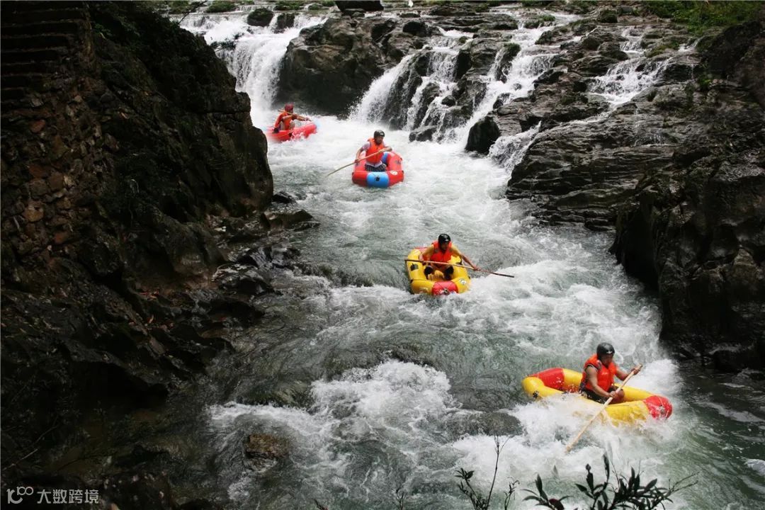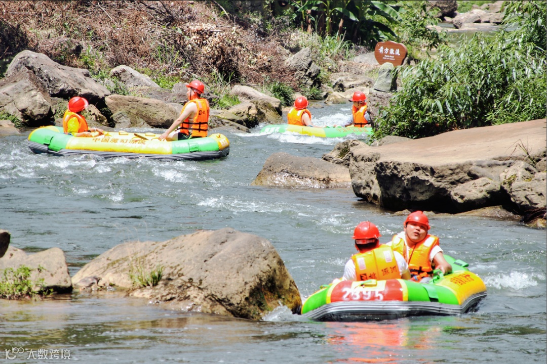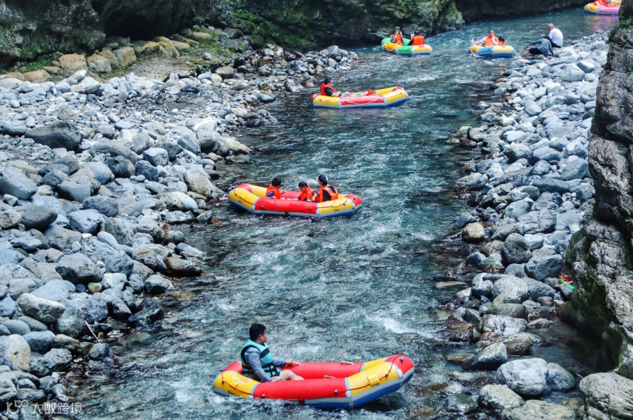 从起点顺流而下,5公里的漂流河道、3小时的漂流时长,落差大、险滩多、水质好,畅想激流勇进的漂流乐趣。