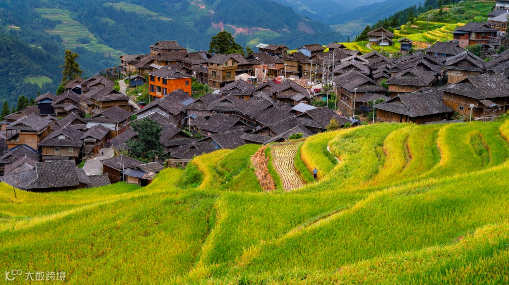 金秋的从江加榜梯田,稻谷在阳光下犹如披上一层黄金甲,绽放出诗意梦幻般的美。满山金黄的稻田与苗家吊脚楼、树木、小路相映,色彩斑斓,动人心魄。