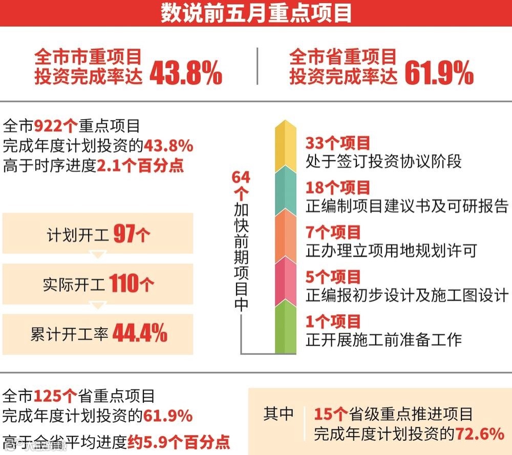 全市922个重点项目完成年度计划投资的43.8%,高于时序进度2.1个百分点。其中,125个省重点项目完成年度计划投资的61.9%,高于全省平均进度约5.9个百分点。