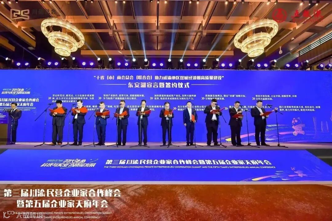 成渝地区双城经济圈建设机遇正吸引着来自全国企业的目光。会上,津商联合会、辽商总会、吉商联合会、龙商总会、湖南异地商会联合会、桂商总会、川商总会、贵商总会、秦商总会、深商总会十省市商会总会(联合会)代表,共同宣读“东安湖宣言”,并签署“助力成渝地区双城经济圈高质量建设”的协议。根据宣言协议,各商会将从推动产业升级、加速科技创新、担当社会责任、弘扬商业文明、践行亲清新型政商关系等方面展开行动,吸引更广泛的全国民营企业家紧密交流合作,促进人才、知识、信息等资源汇集,进一步发挥商协会的桥梁纽带作用,让民营企业在成渝地区双城经济圈建设中展现更大作为、取得更大成就。