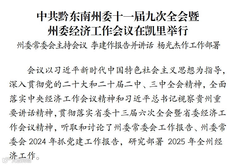 中国共产党黔东南州第十一届委员会第九次全体会议暨州委经济工作会议,于2024年12月28日在凯里举行。州委员会委员48人、候补委员5人出席会议。州纪委委员和有关方面负责同志,省第十三次党代会代表中的部分基层代表、州第十一次党代会代表中的部分基层代表等列席会议。