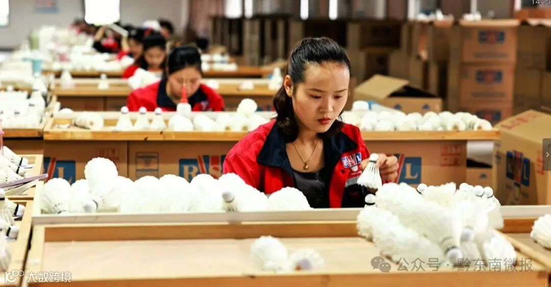 在锦屏县贵州亚狮龙体育文化产业发展有限公司的生产车间,一排排机器飞速运转,工人往来穿梭、娴熟操作,38道工序井然有序地流水作业,一个个精美的羽毛球源源不断地下线。