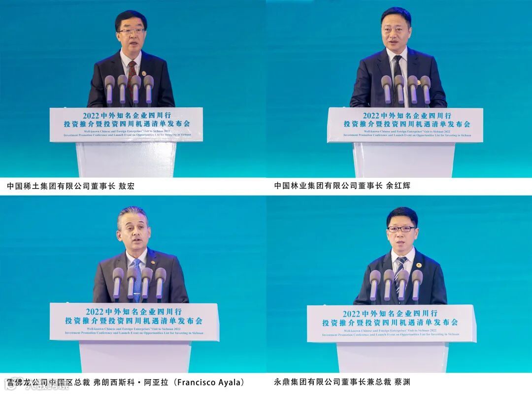活动严格落实疫情防控要求,尽管参会规模大幅压缩,但嘉宾层次仍然很高,充分体现了中外知名企业四川行的品牌吸引力,表明外来企业仍然看好四川的发展潜能和投资潜力。本次大会共吸引了110余家央属国企、“三类500强”、知名跨国公司、行业龙头企业、专精特新企业和知名商协会参会,200余名客商嘉宾共赴四川之约。中国稀土集团有限公司董事长敖宏,中国林业集团有限公司董事长余红辉,雪佛龙公司中国区总裁弗朗西斯科•阿亚拉(Francisco Ayala),永鼎集团有限公司董事长兼总裁蔡渊作为嘉宾代表发言。