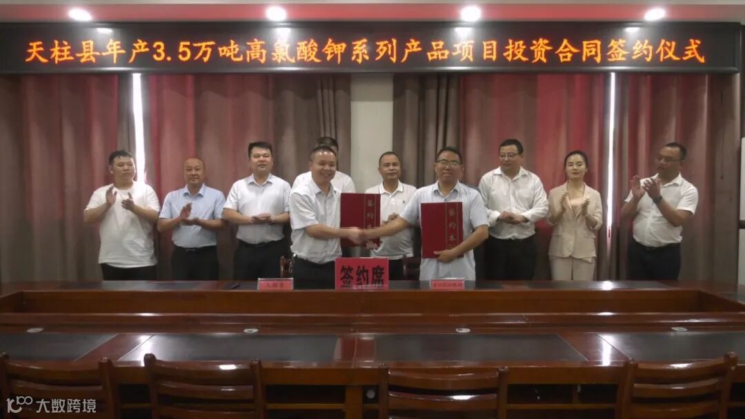5月27日,天柱县年产3.5万吨高氯酸钾系列产品项目投资合同签约仪式在县政府三楼会议室举行。县委常委、副县长蒋大伍,贵州凯桐新材料有限公司总经理张德仁出席签约仪式。