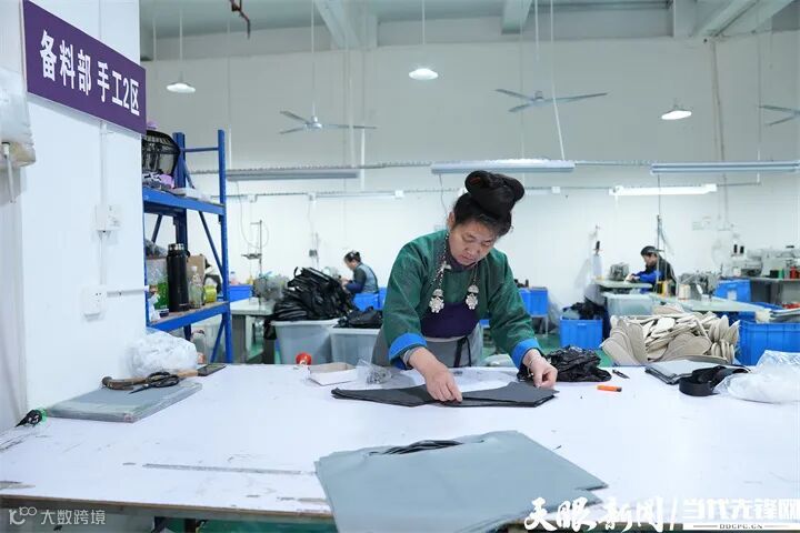 丹寨县金泉街道卡登箱包车间工人在备料