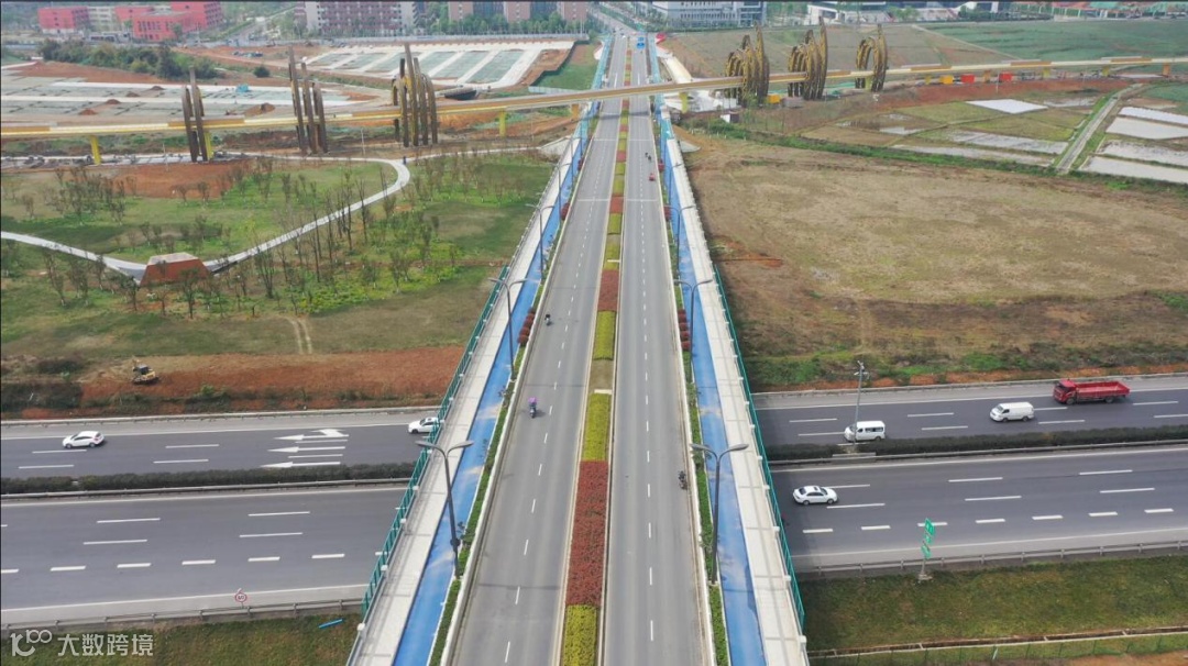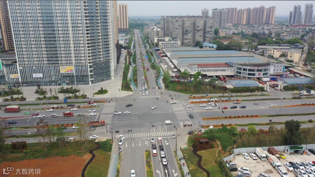 一条笔直畅通的道路从这里延伸到天际线,可以看到路口巨大的太阳神鸟景观造型与“成都成就梦想”大型标识。 机动车道两边的慢行系统,像一条宝蓝色的丝带,飘扬在广阔的大地上。