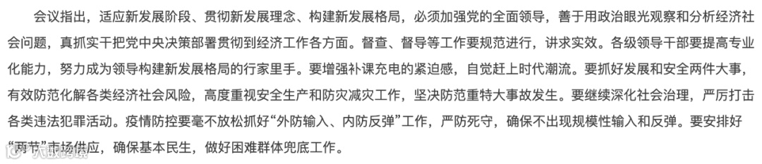 比如,会议提到,领导经济工作必须“尊重客观实际和群众需求,必须有系统思维、科学谋划”“要加强经济学知识、科技知识学习”“坚持正确政绩观,敬畏历史、敬畏文化、敬畏生态,慎重决策、慎重用权”“坚决防止简单化、乱作为,坚决反对不担当、不作为”。