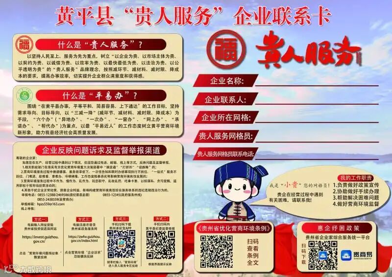 近日,为进一步擦亮“贵人服务”品牌,黄平县辖区内企业大门陆续张贴了一张“黄平县‘贵人服务’企业服务联系卡”,卡片内容简单明了,向企业说明了什么是“贵人服务”,企业公开反映问题诉求和监督举报渠道等,在联系卡中还有《惠企纾困政策》《贵州省营商环境条例》等二维码可供企业随时扫码了解政府出台的相应惠企政策。并且还标注了黄平县服务企业网格员联系人的姓名、联系方式,企业可随时随地与网格员取得联系,寻求帮助。