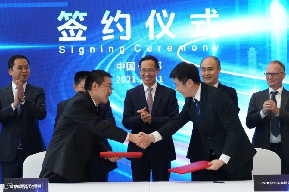 揭幕仪式前,成都市龙泉驿区人民政府副区长杨亚峰与一汽-大众数字化研发中心负责人赵嵩代表政企双方共同签署了项目投资协议。成都市、区主要领导及一汽-大众公司领导见证了签约仪式。