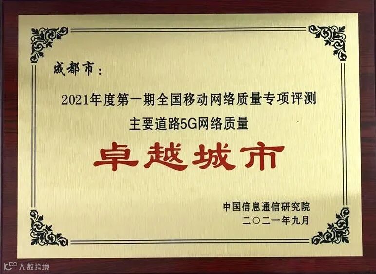 成都市荣获主要道路5G网络质量卓越城市