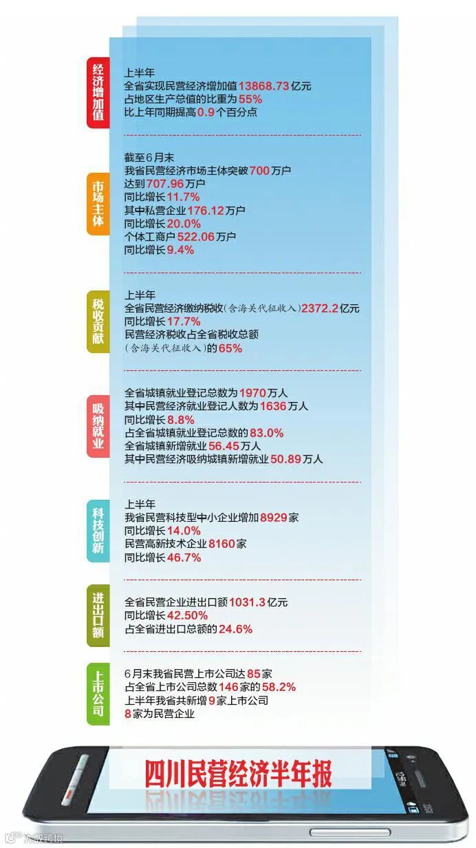 8月16日,“2021年上半年四川省民营经济发展报告及指数”出炉。上半年,四川民营经济运行持续恢复、稳中向好,呈现“前高后稳”态势。民营经济增加值增速高于全国和全省GDP增速,市场主体活跃度稳步提升,民营企业进出口实现快速增长,但仍面临自身复苏不均衡和结构分化等问题。民营经济总体呈现“45699”的基本特征,贡献了47.6%的投资、55.0%的GDP、65.0%的税收、90.2%的新增就业、97.4%的市场主体,为全省经济运行在合理区间做出了积极贡献。