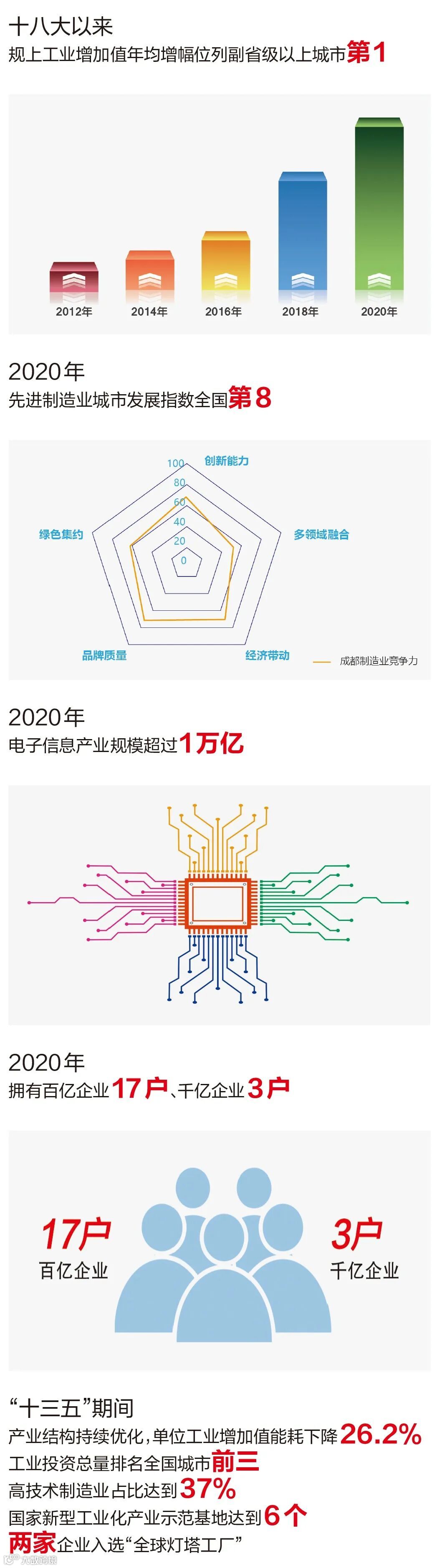一组组沉甸甸的数据、一项项可喜的成绩,见证着成都制造业的百年变迁,更折射出党的十八大以来成都制造业取得的新成就:成都规上工业增加值年均增幅位列副省级及以上城市第一;拥有百亿企业17户,千亿企业3户;“十三五”期间,产业结构持续优化,单位工业增加值能耗下降26.2%,高技术制造业占比提升9.4个百分点,达到37%;工业投资总量排名全国城市前三。