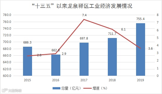 2019年,全区工业增加值达755.4亿元,占全区GDP的比重为57.2%,对全区GDP的贡献率达60.5%,总量较2015年同比增长21.5%,年均增速为5.0%,是拉动我区经济增长的重要支撑。汽车工业规模发展,2015年全区生产汽车整车89.5万台,2016年突破100万台,2017年达到128.5万台,2019年汽车整车产量100.7万台,比2015年增长12.5%,成为全国重要的汽车产业基地,全区经济增长的重要支撑。