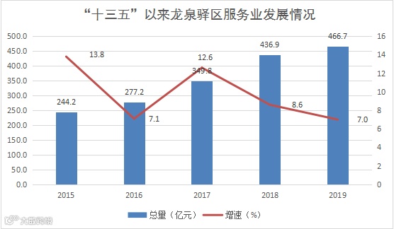 全区服务业增加值由2015年的244.2亿元增加到2019年的466.7亿元,年均增长8.8%,占GDP比重由2015年的24.2%提升到2019年的35.4%。商贸流通业加快发展,现代物流业不断提升,金融服务能力不断增强。2019年全区批发零售业实现增加值54.5亿元,交通运输仓储和邮政业实现增加值40.0亿元,分别比2015年增长23.7%、37.5%,金融机构存贷款余额分别为1172.5亿元、767.2亿元,分别是2015年的1.3倍和1.6倍。