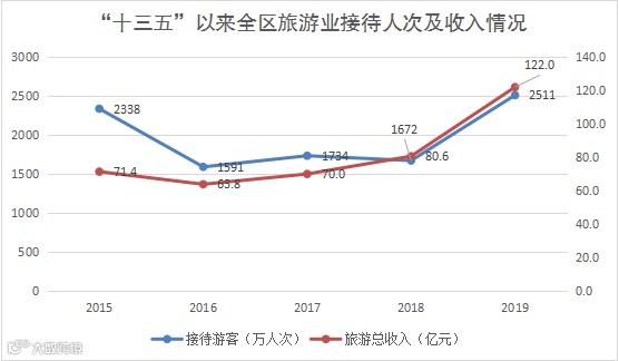 2019年,全区完成固定资产投资总额628.3亿元,比2015年(482.9亿元)增长30.1%,其中民间投资占比40.2%;“补短板”领域投资持续推进,2019年全区基础设施投资较2018年增长3.3%,公共服务业投资增长154.2%。