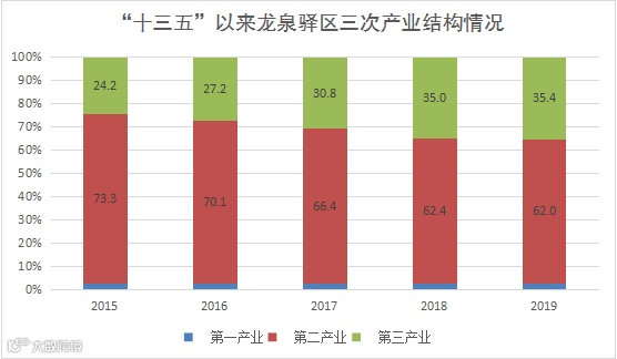三次产业结构从2015年的2.4:73.3:24.3调整为2019年的2.6:62.0:35.4,2017年服务业比重历史性首次突破30%,商务服务、商业综合体、研发服务等现代服务新业态快速发展,2019年服务业占比达到35.4%,比2015年提高11.1个百分点,工业占比由2019年的68.1%调整为57.3%,经济结构持续优化,转型升级成效明显。