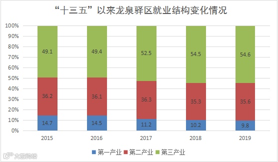 2019年末,全区从业人数有46.8万人,比2015年末(41.1万人)增加5.7万人,其中第二产业吸纳就业人数较2015年增加1.8万人,服务业吸纳就业人数较2015年增加5.4万人,三次产业就业人员结构由2015年的14.7:36.2:49.1调整为9.8:35.6:54.6,服务业成为吸纳就业人成为吸纳就业的主要渠道。