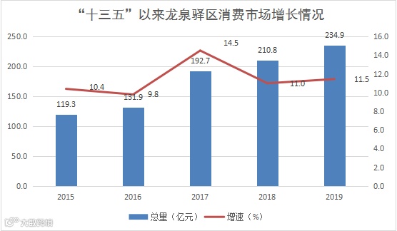 2015以来,全区消费需求稳步提升,2018年全区社会消费品零售总额突破200亿元,达到210.8亿元,2019年实现社会消费品零售总额234.9亿元,比2015年增长了108.4%,年均增长18.4%。自吾悦广场入驻以来,不断涌现万达、驿都汇等集“购物、餐饮、休闲、娱乐、游艺、教育”等功能于一体的城市商业综合体,在方便居民消费的同时,也推动我区消费市场提档升级;城乡市场同步发展,2019年全区城镇实现零售总额205.4亿元,乡村实现零售总额29.5亿元,旺盛的消费需求正推进全区经济结构持续优化。
