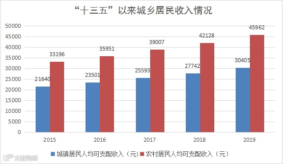 2019年,全区城镇居民人均可支配收入由2015年的33196元提高到2019年的45962元,增长38.5%;农村居民人均可支配收入由2015年的21640元提高到2019年的30405元,增长40.5%,城乡居民收入比由1.53:1下调为1.51:1,城乡居民收入差距进一步缩小,人民生活水平和质量明显提高。