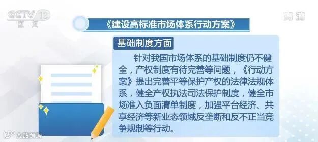 基础制度方面 ,针对我国市场体系的基础制度仍不健全,产权制度有待完善等问题,《行动方案》提出完善平等保护产权的法律法规体系,健全产权执法司法保护制度,健全市场准入负面清单制度,加强平台经济、共享经济等新业态领域反垄断和反不正当竞争规制等行动。