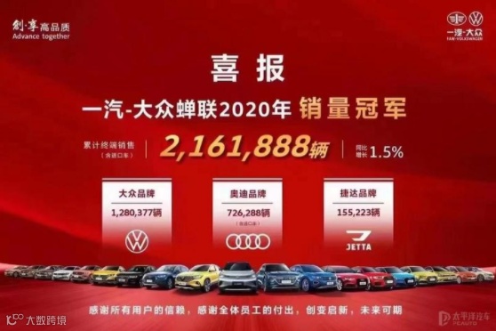 日前,一汽大众官方公布2020年销量成绩,数据显示,其在2020年累计终端销售2161888辆车(含进口车),同比增长1.5%。位居中国销量冠军,也成为了国内唯一一家产销均突破200万辆的乘用车企业。