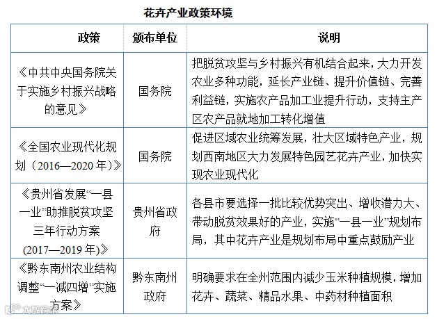 各级政府聚焦乡村振兴与脱贫攻坚,发展特色花卉产业正当其时。种植花卉相较种植传统粮食作物,经济效益更高,是农民脱贫致富的有效方式。因此,各级政府出台多项政策扶持花卉产业发展,从国家层级的乡村振兴战略到贵州省级的脱贫攻坚方案再到黔东南州农业结构调整实施方案,多政策叠加,促进农业乡村发展,为特色花卉产业链打造提供强力支撑。