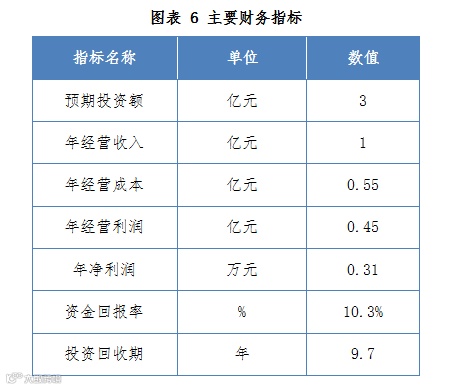 本项目经营利润等于经营收入减去经营成本为4500万元。扣除各种税费,项目年净利润为3100万元。经过简单财务测算,本项目资金回报率为10.3%,项目投资回收期约为9.7年(不含项目建设期)。