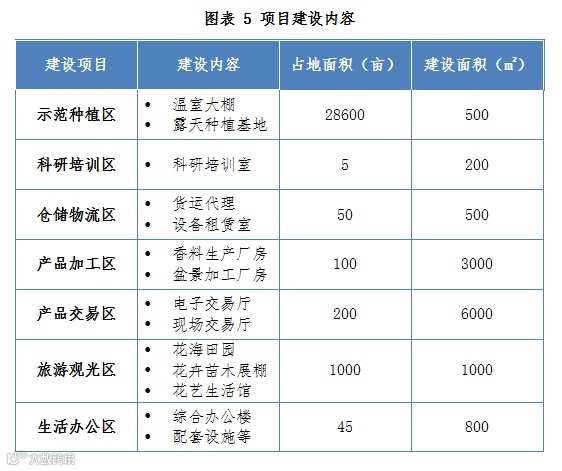 项目建设集花卉苗木种植、观光旅游、产品加工、植物交易、科普教育为一体的花卉苗木产业基地,分为花卉苗木示范种植区、科研培训区、仓储物流区、产品加工区、产品交易区、旅游观光区、生活办公区等功能区域。项目总占地面积3万亩,建筑面积1.2万m2。项目建成后,年产乔木20万株以及灌木、花卉1000万株。