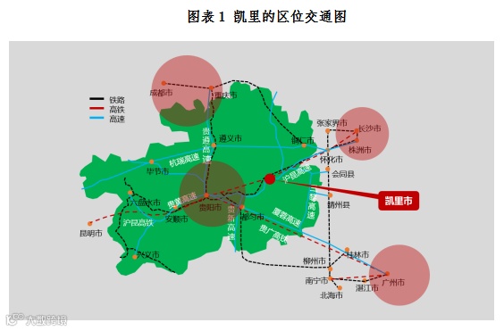 黔东南州位于西南地区东南部,东邻湖南,西倚云南,北连四川,南接广西,是西南连接华东、华中、华南的交通枢纽。凯里是黔东南州的州府所在地,位于黔、桂、湘三省(区)结合部,处于成渝经济区、长株潭经济圈、珠江经济区和黔中经济区的中心地带,地理位置优越,区位优势明显。