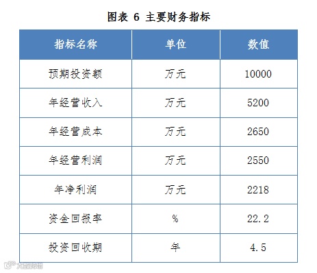 本项目经营利润等于经营收入减去成本为2550万元。参照国家及当地相关税收政策和规定,项目年净利润为2218万元。经过简单财务测算,本项目资金回报率为22.2%,项目投资回收期约为4.5年(不含项目建设期)。