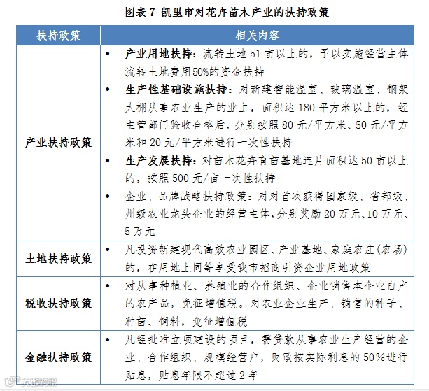 2018年,凯里市政府出台了《凯里市深入推进农业供给侧结构性改革进一步加快现代农业产业发展政策的实施意见》,从产业用地扶持、生产性基础设施扶持、生产发展扶持等方面对花卉苗木产业进行扶持,在政策、资金、技术等方面给予倾斜及税费方面优惠政策。