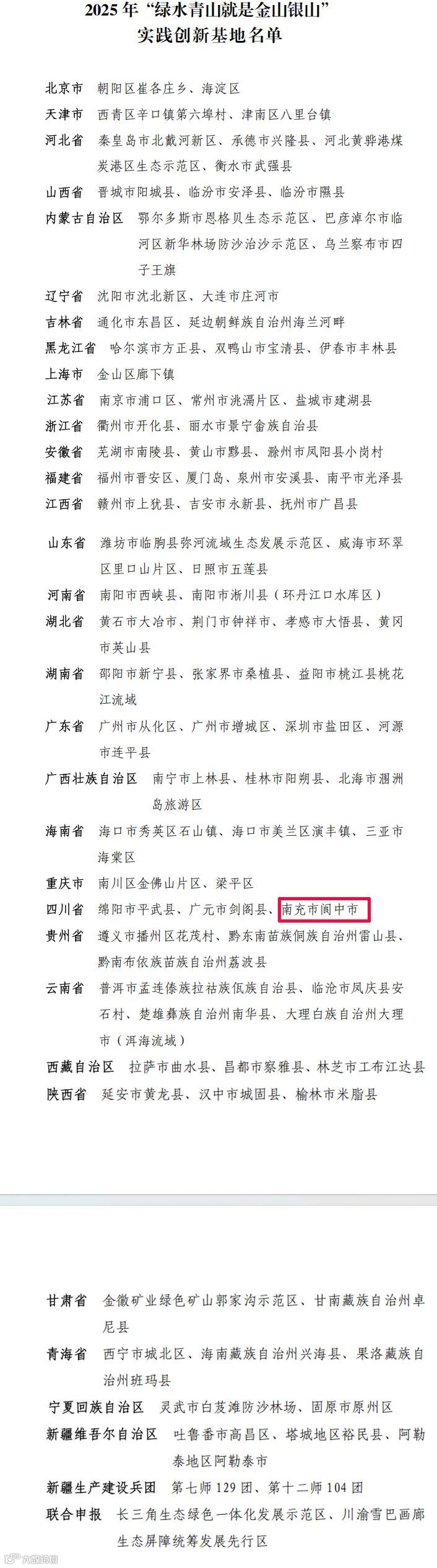 其中,四川省甘孜藏族自治州、泸州市古蔺县、遂宁市射洪市、雅安市芦山县这4个地区被命名为2025年生态文明建设示范区;四川省绵阳市平武县、广元市剑阁县、南充市阆中市、川渝雪巴画廊生态屏障统筹发展先行区(达州市宣汉县、重庆市开州区联合申报)这4个地区被命名为2025年“绿水青山就是金山银山”实践创新基地。
