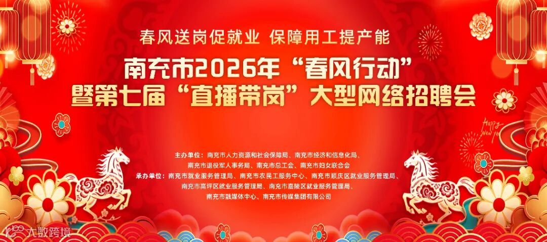 第七届 “直播带岗”大型网络招聘会共安排5场,剩余3场将在2月25日(正月初九,2026年春风行动南充分会场现场巡场直播,嘉陵区政府广场)、2月28日(正月十二)、3月4日(正月十六)上午10:00—12:00在进行。活动将邀请企业负责人、高校就业处代表走进直播间,在线发布岗位信息、毕业生供给信息。活动将通过 FM91.5南充交通音乐广播、南充广播视频号与抖音号、南充融媒客户端、南充人社视频号与抖音号、南充云就业视频号等平台同步直播推送。