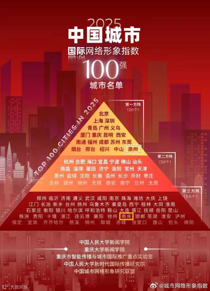 近日,第二届中国城市网络形象创新发展论坛暨《中国城市国际网络形象指数报告(2025)》发布会在重庆举行,会上公布了“2025中国城市国际网络形象指数100强”名单,南充成功上榜,成为四川省内为数不多跻身该榜单的城市之一。