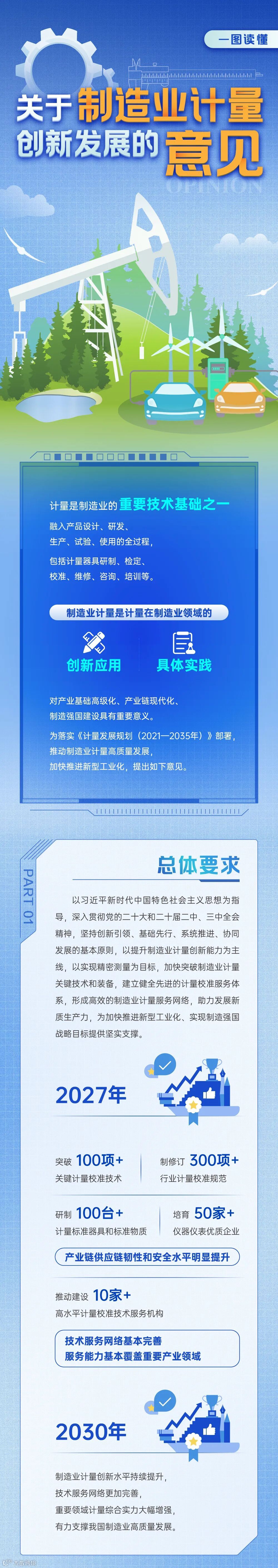 《意见》是制造业计量领域首个政策性文件,坚持创新引领、基础先行、系统推进、协同发展的基本原则,以提升制造业计量创新能力为主线,以实现精密测量为目标,结合当前产业现状和制造业高质量发展要求,提出到2027年,制造业计量发展取得积极进展,突破100项以上关键计量校准技术,制修订300项以上行业计量校准规范,研制100台套以上计量器具和标准物质,产业链供应链韧性和安全水平明显提升,培育50家以上仪器仪表优质企业,推动建设10家以上制造业高水平计量校准技术服务机构,技术服务网络基本完善,服务能力基本覆盖重要产业领域。到2030年,制造业计量创新水平持续提升,技术服务网络更加完善,重要领域计量综合实力大幅增强,有力支撑我国制造业高质量发展。