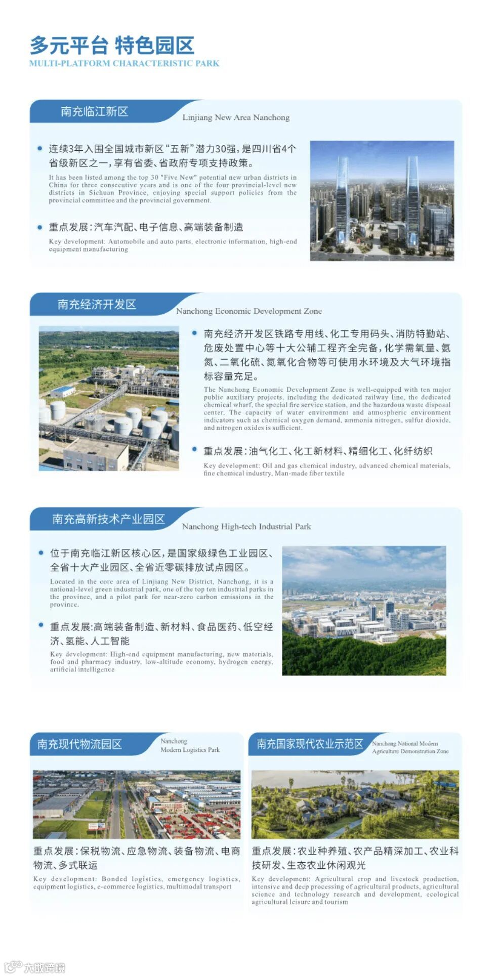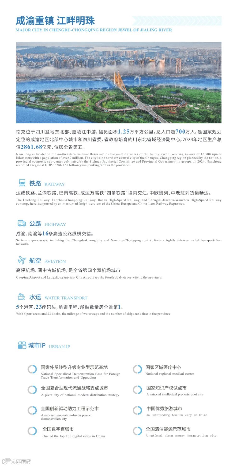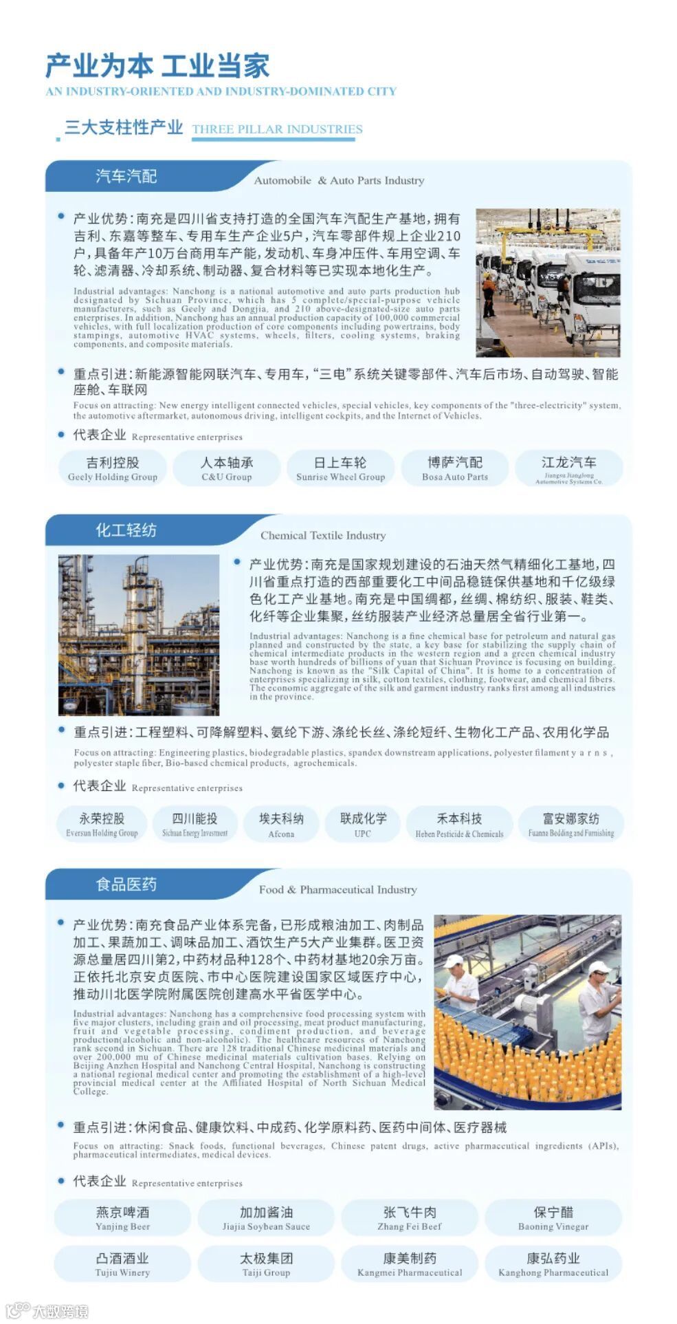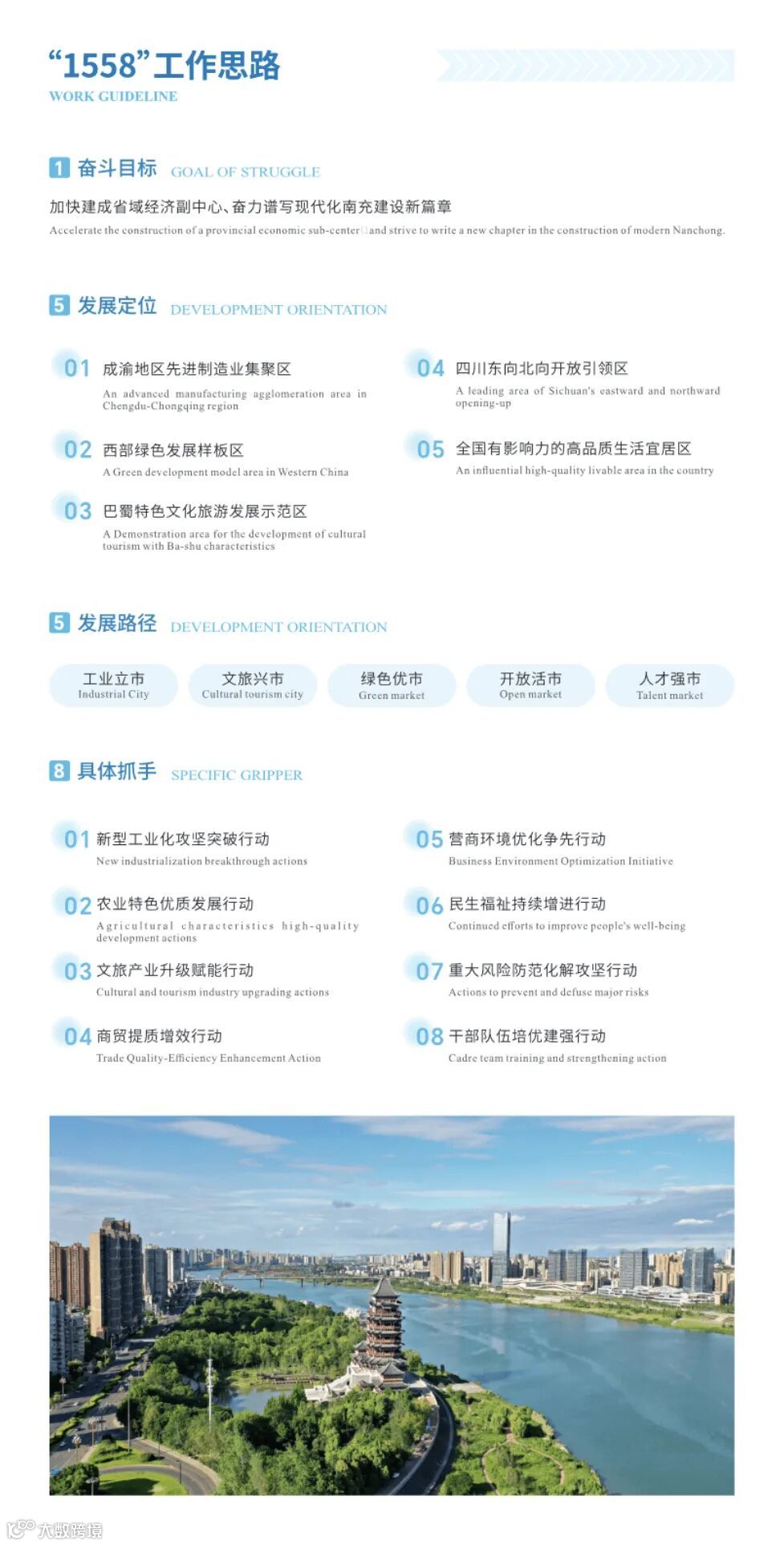 投资指南从五大篇章对南充的城市概况、发展定位、重点产业、特色园区等方面进行了介绍。