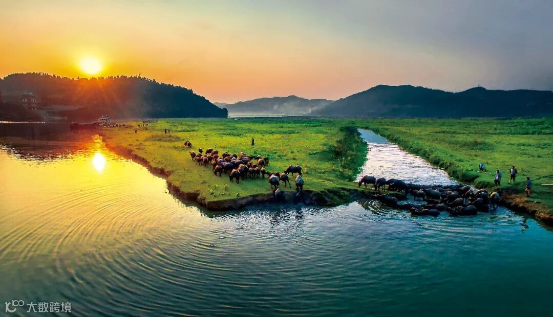 每年4月底,嘉陵江放牛季都会在蓬安县如期举办。两岸农家水牛竞渡,牛鸟和谐共生,生态野趣盎然,日接待游客近万人次。
