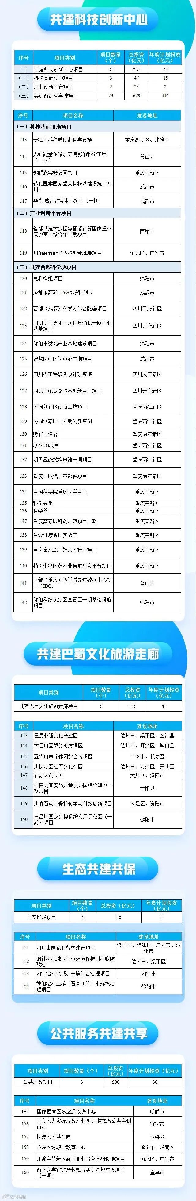在具体领域上,则分属合力建设现代基础设施网络项目、协同建设现代产业体系项目、共建科技创新中心项目、共建巴蜀文化旅游走廊项目、生态屏障项目、公共服务项目等领域。