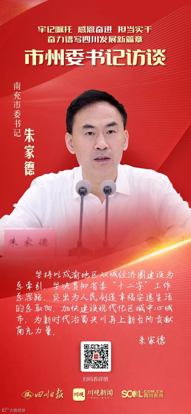 牢记领袖嘱托,拼搏实干担当。嘉陵江畔的南充,正涌动着深入学习习近平总书记来川视察重要指示精神和省第十二次党代会精神的热潮。始终沿着习近平总书记指引的方向,奋力把宏伟蓝图转化为美好现实。新征程上,南充如何谋、怎样干?近日,川观新闻记者专访了南充市委书记朱家德。