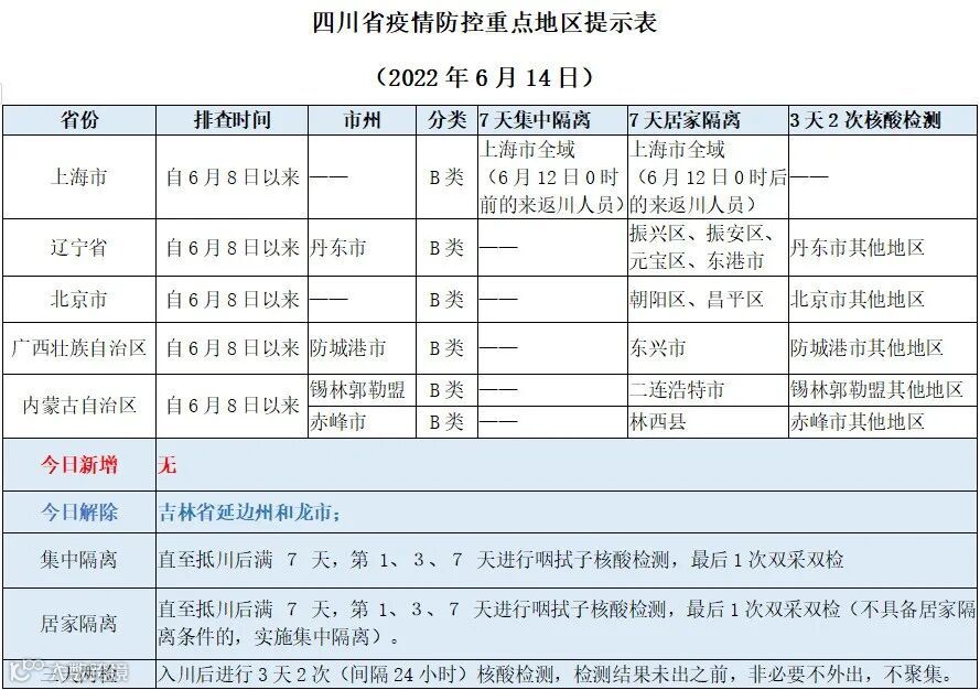 从6月12日0时起,上海市全域由A类地区调整为B类地区,对近7天内有上海市旅居史来(返)川人员实施7天居家隔离至抵川后满7天。居家隔离期间,共同居住人员应同时实行居家隔离,不具备居家隔离条件的或不接受共同居住人员隔离的,实行集中隔离。