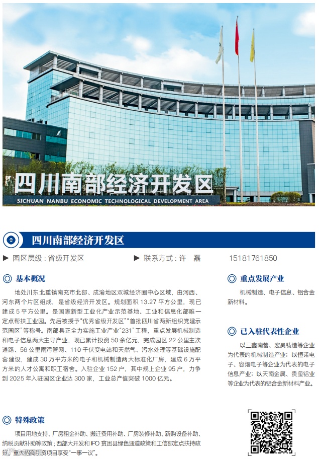 是省级经济技术开发区,所辖南充化学工业园是四川省规划建设的“三大石化基地”之一。园区是四川省重点培育的千亿产业园区和省级首批循环经济示范区、省级绿色制造示范单位、省级首批生态环境法治示范园区,已建成铁路专用线、化工专用码头、危废处置中心等十大公辅设施,具有专注化工产业、区位条件优越、无邻避风险、环境容量大、公辅配套完善、要素成本低等优势,已成为西南地区少有的符合长江经济带绿色发展理念的专业化工园区。