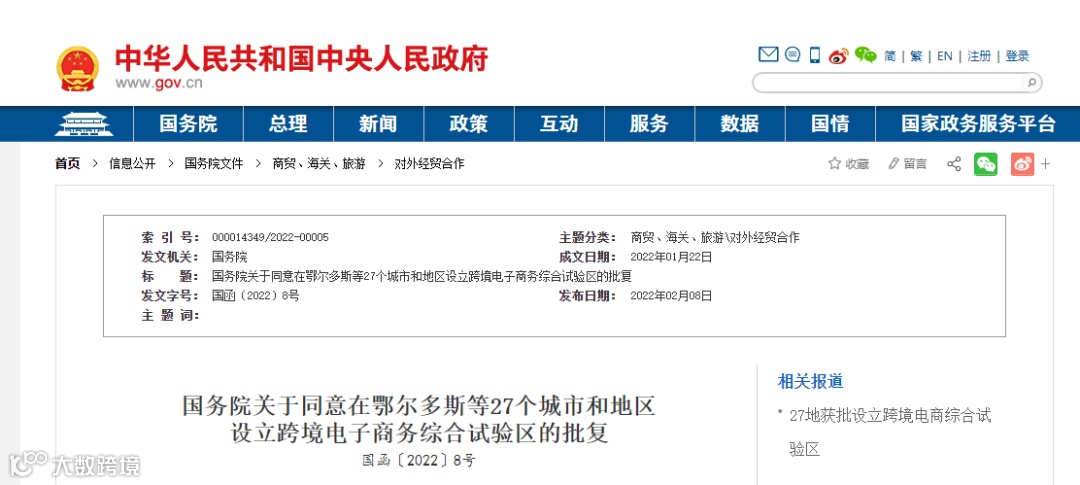 你们关于设立跨境电子商务综合试验区的请示收悉。现批复如下: