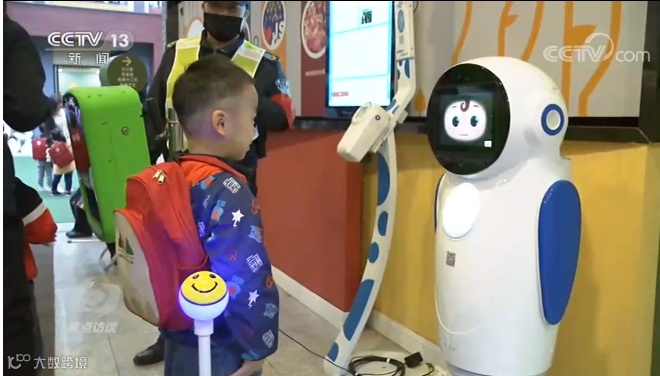 镜头里,成都市金牛区机关第三幼儿园的门口,小朋友入园前都要跟一款名叫“小诺”的机器人打招呼。识别身份、检测身高体重体温、对话交流,这一过程只需要5秒钟。“小诺”的加入,让以往单调的检查更有趣味,小朋友们都说“它每天都有各种各样的图形”。
