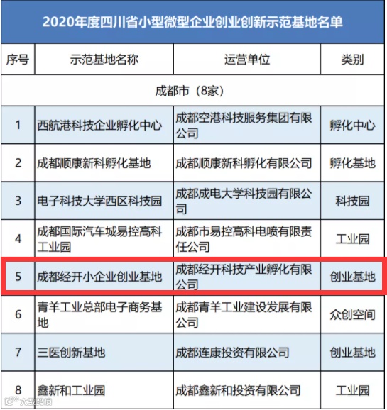 为进一步提升我省小型微型企业创业创新示范基地的创业孵化和服务能力,推动全省小企业创新创业、加快成长和集聚发展,根据《四川省小型微型企业创业创新示范基地建设管理办法》(川经信创服〔2018〕12号)《关于开展2020年度四川省小型微型企业创业创新示范基地申报工作的通知》(川经信办函〔2020〕64号)文件精神,经主体自愿申报、市(州)经济和信息化主管部门推荐、专家评审、现场核实、公示等程序,四川省经济和信息化厅确定了2020年度四川省小型微型企业创业创新示范基地(以下简称示范基地)名单。其中,成都经开小企业创业基地成功入选。
