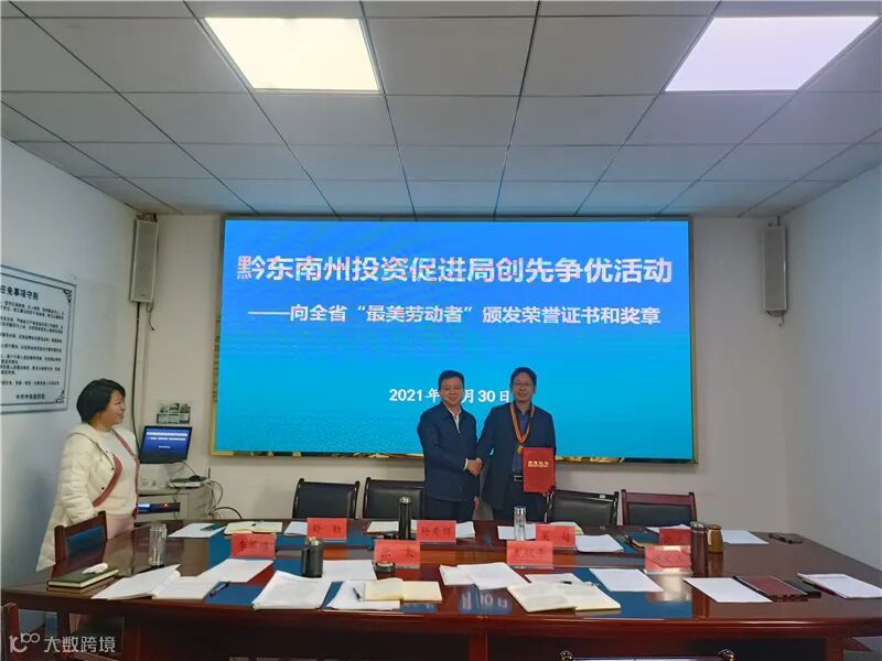 近期,贵州省总工会发布了一批2021年贵州省“最美劳动者”名单,其中,黔东南州投资促进局投资服务与投诉协调科科长杨文玉获此殊荣。10月30日,黔东南州投资促进局党组书记、局长杨秀辉同志向杨文玉同志颁发了“最美劳动者”荣誉证书及奖牌。