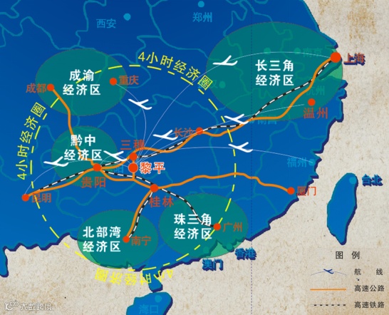 航空:黎平机场已开通黎平至贵阳、广州、上海、长沙、重庆等7条航线,后续即将开通黎平至北京、深圳、成都等全国主要城市航班。铁路:贵广高铁横穿黎平县境内,乘高铁至贵阳约1.5小时;至广州约3.5小时。规划在黎平设站点的兴义—永州铁路项目已纳入《国务院关于深化泛珠三角区域合作的指导意见》(国发〔2016〕18号)。高速公路:黎洛高速、三黎高速、厦蓉高速、沪昆高速贯穿黎平全境,至贵阳仅3小时车程。黎平—湖南靖州高速公路已经开工建设,黎平—剑河高速公路已启动招投标程序。