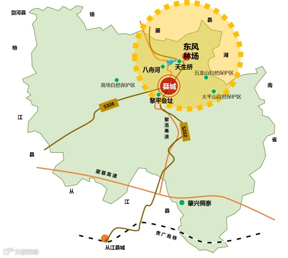 黎平县位于贵州省东南部,地处黔湘桂三省(区)交界处,是黔湘桂交汇区域中心城市。全县国土面积4441平方公里,总人口56万人,其中侗族人口占71%,是全国侗族人口第一县、贵州国土面积第二大县和黔东南州人口第一大县,是一座集历史文化、红色文化、民族文化和生态文化于一身的文化名城。黎平县国有东风林场是黎平国家森林公园核心景区,已建部分设施,区位交通便利,适宜纵深打造。